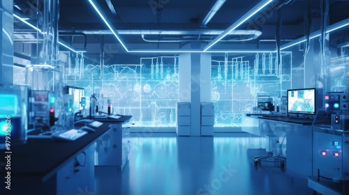 laboratory, science, research, technology, innovation, experiment, futuristic, modern, computer, screen, desk, equipment, glassware, beaker, flask, tube, pipette, machinery, datum, digital, analysis, experimentation, discovery, progress, sterile, clean, white, blue, light, neon, glow, high technology, interior, architectural, design, technically, advanced, engineering