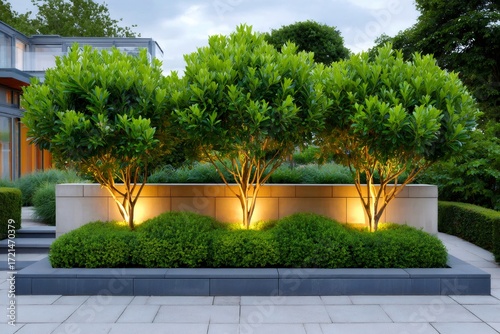 Modern garden landscaping featuring illuminated trees and lush shrubs