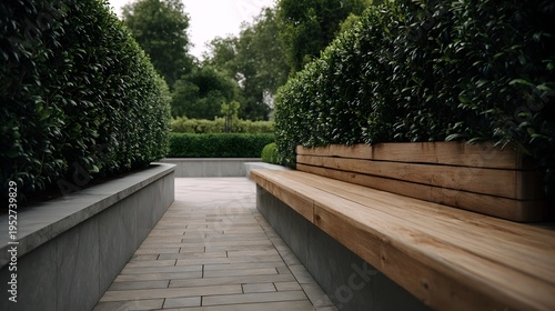 garden, park, nature, bench, wood, stone, pathway, green, bush, hedge, modern, minimalist, design, landscape, architecture, seating, tranquil, calm, peaceful, urban, courtyard, patio, exterior, natural, plant, foliage, greenery, arrangement, structure, symmetry, clean, simple, serene, elegant, sophisticated, cultivated, manicured, geometric, paseo, paved, ground, daylight, overcast, shadow, light, perspective, scene, view