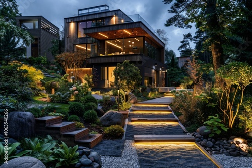 gardening, modern, illuminated, pathway, residential, house, garden, landscape, outdoors, light, lawn, home, path, plant, greenery, entrance, yard, outdoor lighting, architecture, landscaping, night, paseo, design, tree, shrub, grass, front yard, nature, illumination, decoration, garden design, evening, elegant, tranquil, clean, neighbourhood, 1, technology, lifestyle, copy space