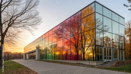 Modern glass building reflecting colorful hues of a stunning sunset alongside vibrant autumn trees, creating an engaging and picturesque urban scene filled with warmth and beauty