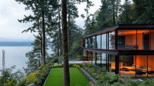 house, modern, glasses, lake, forest, tree, wood, architecture, home, design, contemporary, luxury, waterfront, scenic, view, landscape, nature, exterior, building, residential, style, elegant, sophisticated, peaceful, tranquil, serene, calm, relaxing, green, grass, plant, garden, path, stone, evening, twilight, dusk, light, illumination, window, wall