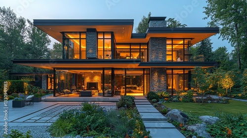 modern, architecture, glasses, house, nature, landscape, garden, exterior, evening, light, design, home, luxury, tree, stone, patio, paseo, peaceful, contemporary, living space, window, warm, sunset, illumination, greenery, structure, beauty, calmness, residential, open space, retreat, sophisticated, aesthetic, environment, insulation, siding, urban, natural, artistic, landscaping, architecture style, upscale, property, setting, vibrant, appealing, peacefulness