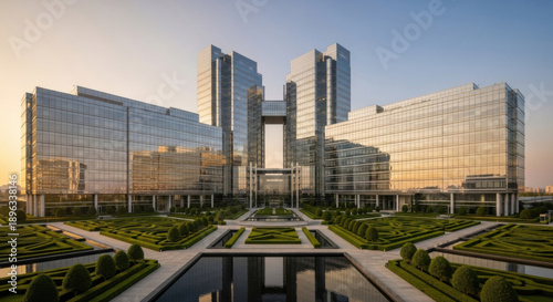 building, office, corporate, glasses, modern, architecture, skyscraper, complex, facades, reflective, pool, garden, pattern, landscape, parterre, manicured, hedge, green, symmetry, urban, city, sunset, sunrise, glass wall, twin towers, courtyard, frame, line, structure, minimal, professional, business, calm, serene, modernism, lifestyle, ambience, planning, geometry, reflectance, development, design, engineering, landmark