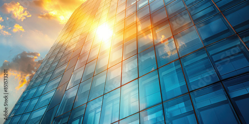 Modern glass skyscraper with sunlight reflecting off its surface, symbolizing contemporary architecture and urban innovation.