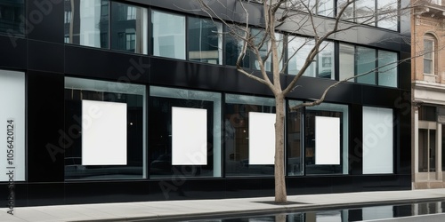 Modern glass storefront, minimalist architecture, empty retail space, reflective windows, black metal framing, urban setting, clean lines, commercial property, street view, transparent facade, contemp