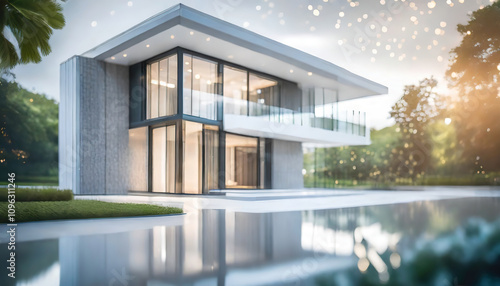 modern, house, glasses, architecture, tree, pool, evening, bokeh, light, tranquil, serenity, luxury, design, water, villa, minimalist, landscape, contemporary, nature, surrounding, residential, estate, exterior, modernism, property, glazing, sunset, urban, elegant, upscale, sleek, living, showcase, aglow, neighbourhood, luxury home, background, ai, generated