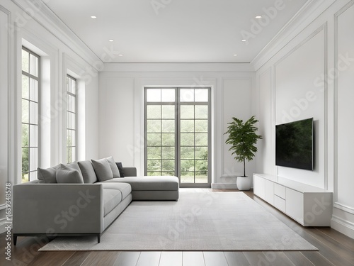 Modern Gray Sectional Sofa in Bright White Living Room with Large Windows