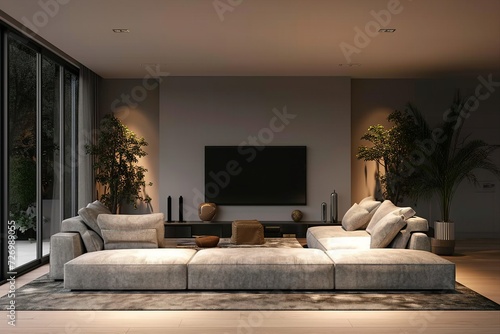 Modern grey minimalist interior livingroom with large gray modular sofa, panoramic windows and palm trees. TV wall mockup. Front view night lighting. generative ai.