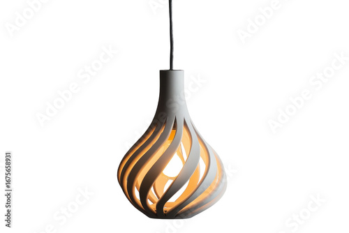 Modern grey pendant light with a unique design illuminated against a simple backdrop
