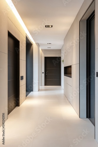 hallway, interior, modern, minimalist, design, architecture, decor, home, apartment, contemporary, roomy, light, bright, clean, sleek, neutral, luxury, elegant, sophisticated, white, grey, black, door, wall, floor, ceiling, lighting, interior design, home decor, real estate, photo, photo, empty, high-end, living space, open space