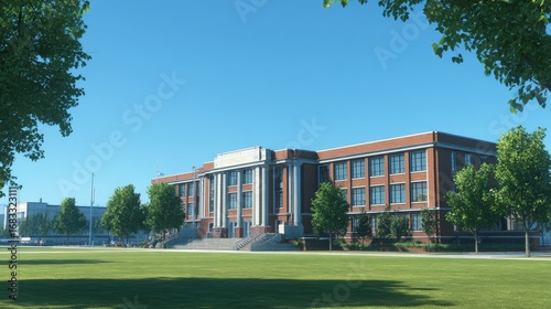 Modern high school building with wide front lawn, contemporary architecture, glass windows, and welcoming student-friendly educational campus environment