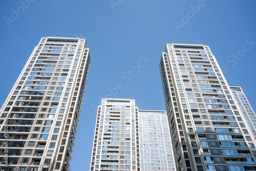 Modern high-rise residential buildings captured from a low angle against a clear blue sky
