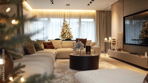 living room, christmas, christmas tree, festive, cosy, interior design, home decor, contemporary, sofa, cushion, coffee table, candle, television, christmas lights, elegant, stylish, luxury, minimalistic, carpet, centrepiece, holiday season, winter, indoor, comfortable, relaxation, family room, home interior, holiday spirit, chandelier, decoration, premium, chic, sophisticated