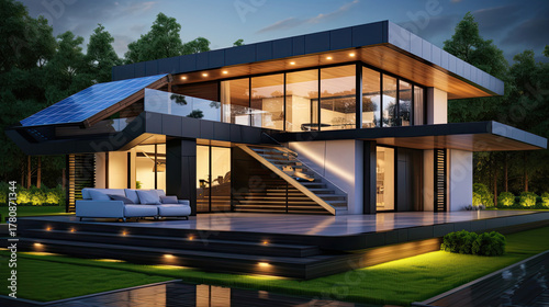 Modern home design with solar panels offers sustainable living for eco-conscious families wanting luxury and style, a perfect blend of nature and architecture