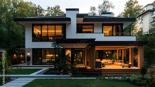 house, modern, exterior, home, architecture, design, luxury, contemporary, residence, illuminated, evening, garden, landscaping, patio, deck, wood, glasses, window, lighting, tree, grass, stone, step, furniture, elegant, stylish, residential, property, investment, facades, construction, building, new, landscape