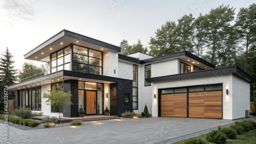 modern, home, exterior, design, architecture, real estate, luxury, house, building, property, facades, residential, contemporary, style, estate, driveway, garage, window, door, landscape, yard, tree, plant, lawn, sky, daylight, outdoors, urban, suburban, black, white, wood, stone, pavement, sidewalk, path, light, entrance