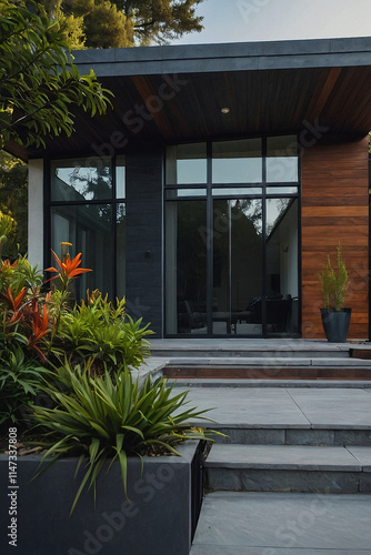 Modern home exterior with dark gray siding, large windows, wood paneling accents, and stone steps leading to the entrance. Lush green landscaping is in a planter box at the base of the steps.