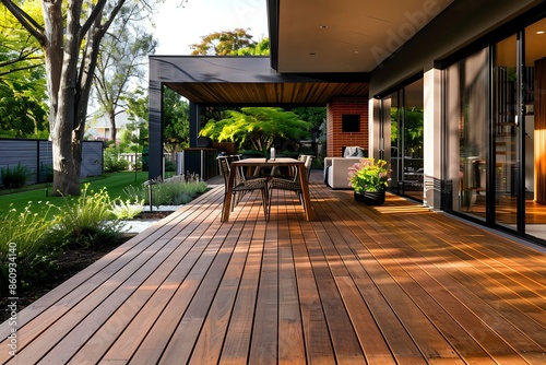 backyard, garden, landscaping, house, home, design, architecture, contemporary, relaxation, dining, entertainment, grill, fence, tree, plant, grass, sunlight, shadow, summer, warm, inviting, cosy, comfortable, stylish