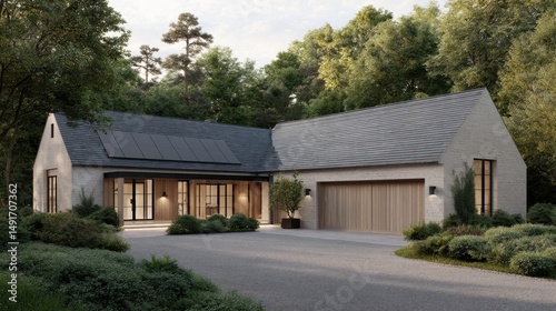 Modern Home Oasis Solar Panels with Greenery, and and Timeless Design.