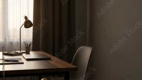 desk, laptop, lamp, chair, table, office, home, work, workspace, wood, furniture, modern, minimalist, simple, clean, interior, design, room, window, curtain, shadow, light, natural, daylight, bright, cosy, comfortable, ergonomic, productivity, organisation