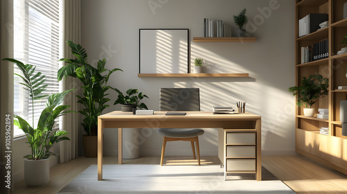 home office, minimalism, workspace, natural light, interior design, office furniture, desk lamp, bookshelf