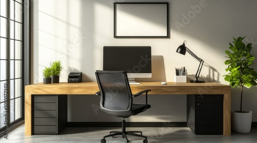 office, workspace, desk, furniture, interior, modern, plant, chair, computer, sunlight, minimal, organisation, interior design, stylish, professional, productive, setup, home office, black-and-white