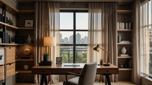 office, home, desk, chair, window, city, view, modern, wooden, shelf, book, lamp, light, curtain, room, interior, design, workspace, apartment, building, study, work, space, comfortable, stylish, elegant, contemporary, minimalist, neutral, sophisticated, calm, peaceful, serene, cosy, relaxing, organised, clean, bright, airy, roomy, lifestyle, luxury, architecture, decor