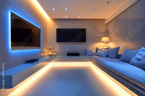home, theatre, room, modern, ambient, lighting, led, light, sofa, couch, cushion, pillow, television, television, screen, wall, floor, ceiling, contemporary, design, decor, style, elegant, luxurious, comfortable, relaxing, entertainment, media, technology, white, blue, yellow, warm, cool, bright, dark, sleek, minimalist, indirect, glow, integrated, built, in, furniture, system, sound