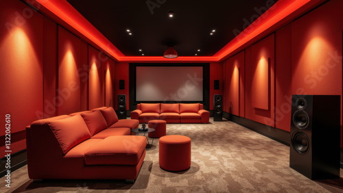 Modern home theater with high-quality audio equipment, featuring orange acoustic wall panels and a comfortable seating area.
