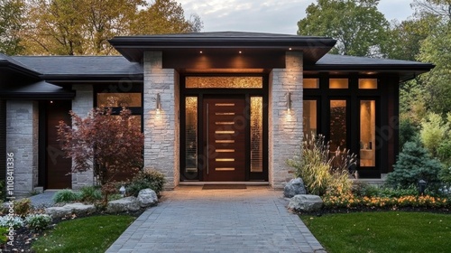 Modern home's exterior at dusk, featuring a stone facade, dark wood door, and landscaped walkway.