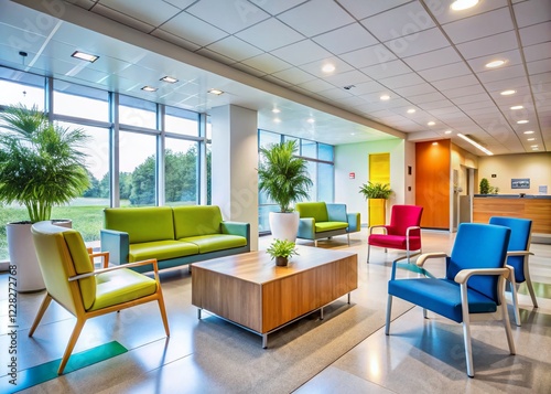 Modern Hospital Reception Area: Comfortable Waiting Room Chairs & Desk