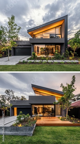 modern, architecture, house, home, contemporary, design, exterior, facades, sleek, minimalist, stylish, luxury, residential, dwelling, building, landscaping, garden, lawn, tree, plant, pathway, driveway, lighting, window, glasses, roof, angled, dark, grey, wood