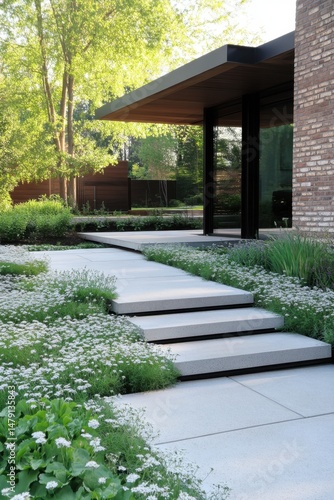 Modern House Entrance with Concrete Steps and White Flowers in Garden Landscape Design at Daytime