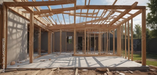 Modern house extension framing, under construction, beam, building site, exterior