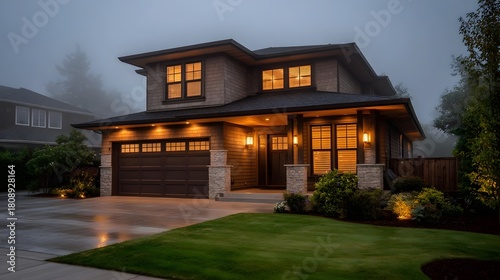 modern, house, exterior, dusk, foggy, illuminated, residential, home, residence, dwelling, property, architecture, building, contemporary, design, facades, roof, door, garage, porch, column, stone, wood, siding, suburban, landscape, lawn, grass, garden, tree, shrub, plant, twilight, evening, night, fog, misty, atmospheric, moody, serene, lit, glow, warm, nobody, street, driveway, upscale
