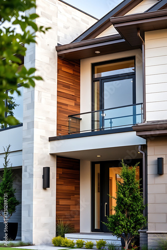 Modern House Exterior: Contemporary Home Design with Balcony and Stone Facade