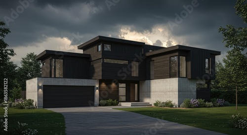 house, modern, exterior, contemporary, architecture, design, home, residence, facades, dark, grey, concrete, wood, window, door, garage, driveway, landscape, garden, tree, sky, cloud, sunlight, dramatic, light, shadow, evening, day, urban, building, structure, modernism, property, stylish, elegant, luxurious, front, dwelling
