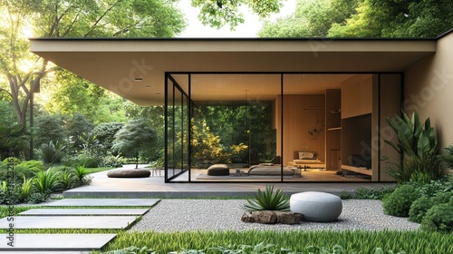 house, modern, architecture, home, design, minimalist, contemporary, building, villa, luxury, exterior, glasses, wall, window, landscaping, garden, green, tree, nature, peaceful, serene, tranquil, zen, japanese, style, patio, paseo, stone, plant, sunlight, light, roomy, open, airy, comfortable, elegant, aesthetic, beautiful, residential, property, real estate, living, room, interior, scene, view