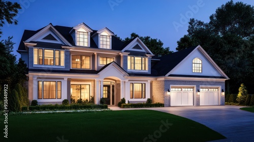 house, home, residence, architecture, exterior, building, yard, lawn, garden, garage, door, window, night, evening, twilight, illuminated, light, residential, real, estate, property, suburban, luxury, modern, contemporary, design, style, brick, stone, roof, landscape, driveway, pathway, green, grey, white, blue, black, dark, bright, warm, colours, lighting, street
