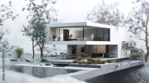 modern, house, home, architecture, design, contemporary, building, snow, winter, landscape, nature, tree, plant, minimalist, style, exterior, balcony, window, glasses, outdoors, daytime, white, grey, serene, peaceful, calm, beautiful, luxury, living, roomy, comfortable, cosy, elegant