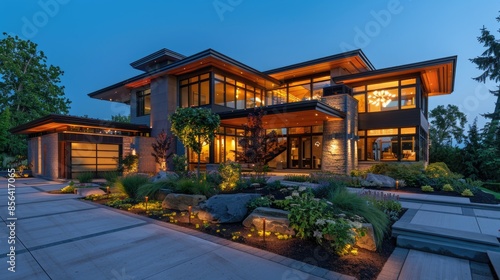 Modern house with beautiful landscape and outdoor lighting