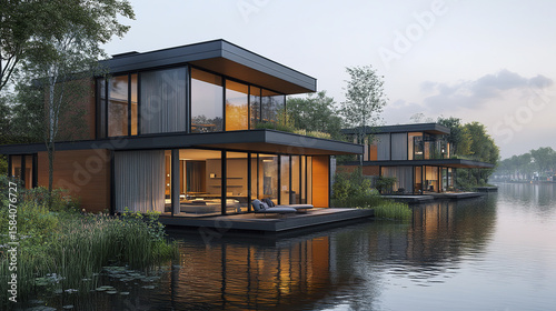 modern, house, glasses, window, wooden, water, lake, nature, tree, greenery, dusk, calm, architecture, exterior, landscape, residential, luxury, waterfront, peaceful, serene, deck, patio, home, building, real estate, environment, sky, cloud, grass, shrub, contemporary, relaxation, evening, natural, scenic, tranquil, river, forest, bungalow, vacation, lifestyle, dwelling, property, modern architecture