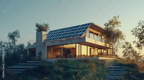 Modern house with solar panels - 3d animation.