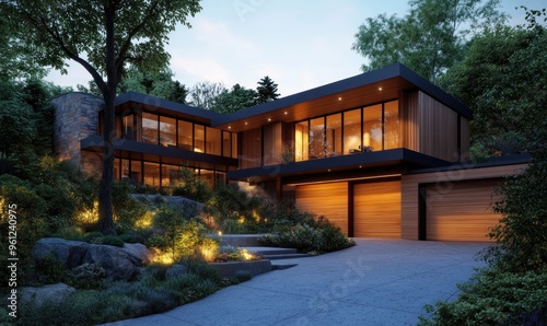 house, modern, architecture, home, contemporary, design, luxury, exterior, residential, real, estate, wood, stone, garage, glasses, window, door, landscaping, lawn, garden, driveway, pathway, step, evening, twilight, dusk, night, light, illumination, dark, sky, tree, foliage, green, brown, grey, concrete, natural, elegant, minimalist, stylish, sophisticated, property