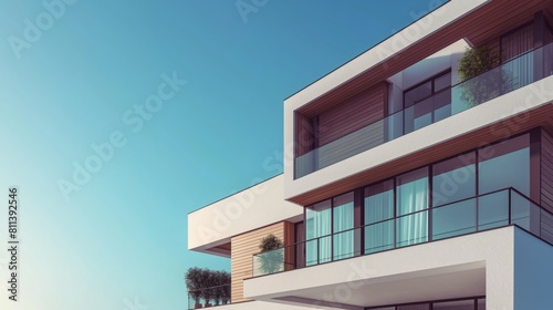 interior, design, real estate, contemporary, modern, house, wooden, accent, white, wall, exterior, balcony, second, floor, photorealistic, architecture, photo, high, resolution, highly, detailed, closeup, shot, professional, colours, grading, soft, shadow, no, contrast, clean, sharp, sharpened, mag, style, clear, blue, sky, building, minimalist, sleek, elegant, sophisticated, aesthetic, stylish, inviting, vibrant, chic, window