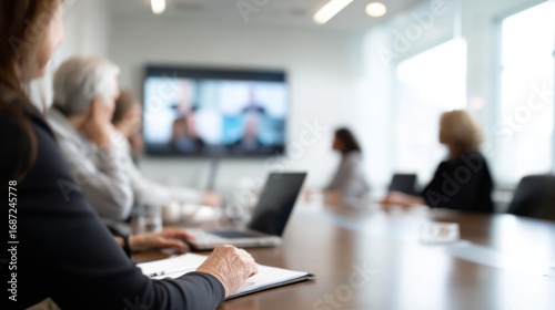 meeting, hybrid, conference, collaboration, technology, professional, workspace, participant, communication, business, teamwork, remote, screen, laptop, note, discussion, office, modern, engagement, interaction, digital, presentation, group, connection, virtual, strategy, planning, productivity, leadership, brainstorming, idea, sharpened, environment, meeting room, glasses, lighting, blurred, corporate, business meeting
