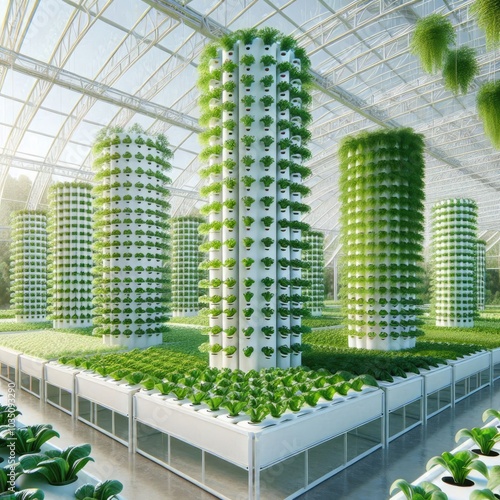 Modern Hydroponic Greenhouse with Vertical Farming Towers Growing Lush Green Vegetables, Showcasing Sustainable Agriculture Techniques and Innovation in Eco-Friendly Food Production