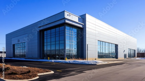 building, industrial, exterior, modern, architecture, commercial, structure, design, factory, warehouse, office, corporate, property, construction, contemporary, metal, glasses, window, facades, daylight, sunny, sky, blue, parking, lot, landscape, winter, snow, ground, day, clear, bright, clean, line, geometric, steel, business, industry, development