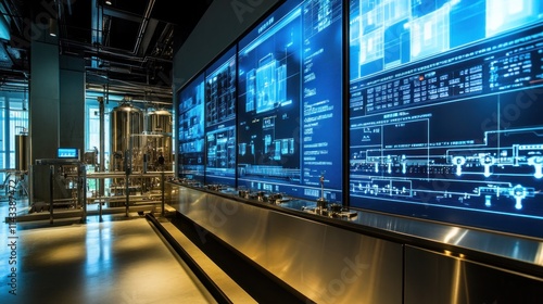 glasses, automation, control, blue, modern, tank, system, interior, white, machinery, industrial, information, window, interface, production, panel, monitoring, digital, pipe, black, process, bright, empty, wall, room, graphic, electronic, operation, factory, dashboard, floor, technology, screen, datum, futuristic, equipment, engineering, steel, clean, display, metal, stainless, light, diagram, manufacturing